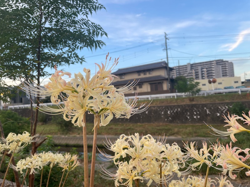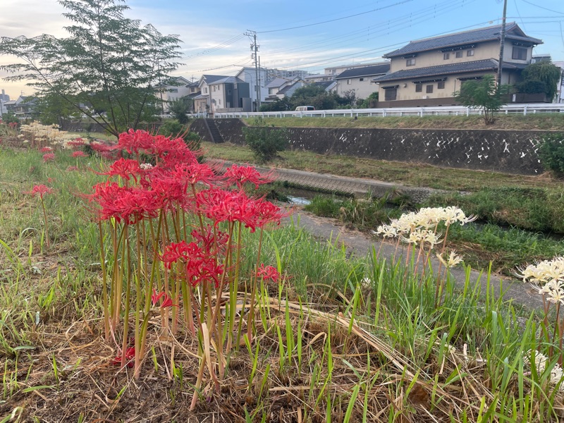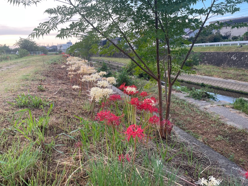 猛暑のせいか、近くでは激減した彼岸花が、香流川の護岸で見つけました。それも紅白で!